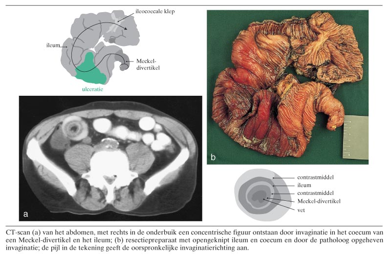 Een 63-jarige man werd verwezen in verband met sedert 7 maanden bestaande intermitterende pijn rechts in de onderbuik. Er was elders CT verricht die aanwijzingen opleverde voor een invaginatie van het terminale ileum (figuur). Kort na de eerste presentatie kreeg patiënt plots buikpijn die rond de navel gelokaliseerd was, maar daarnaast had hij hevige, kortdurende, koliekachtige pijn rechts in de onderbuik. Bij lichamelijk onderzoek was er een weerstand rechts in de onderbuik palpabel. Er werd besloten tot operatief ingrijpen; daarbij werd er een langgerekte invaginatie van het terminale ileum in het coecum gevonden, die gereseceerd werd. Pathologisch…