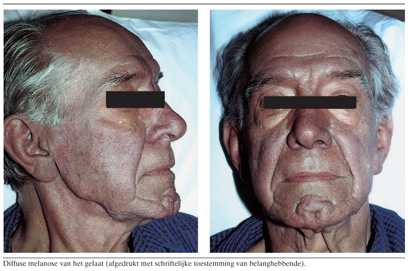 Een 80-jarige man met een blanco voorgeschiedenis werd naar ons ziekenhuis verwezen in verband met anemie en gewichtsverlies. Hij klaagde over verminderde eetlust en donkerbruine urine. De omgeving was het opgevallen dat zijn gelaatskleur in toenemende mate grijsblauw werd. Bij lichamelijk onderzoek zagen wij een cachectische man met een typische gelaatskleur (figuur), een vergrote lever en milt en een palpabele afwijking in de onderbuik. Bij oesofagoduodenoscopie werden multipele zwarte slijmvliesafwijkingen gezien passend bij metastasen van een maligne melanoom. Dit vermoeden werd bij histopathologisch onderzoek bevestigd. Diffuse melanose is een zeldzaam fenomeen bij patiënten met een maligne melanoom…