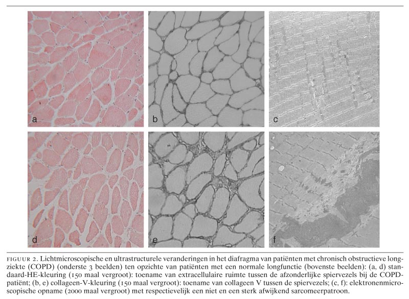 Bij voortschrijdende COPD gaat de belasting van het diafragma over van duurtraining in chronische overbelasting. Deze chronisch verhoogde belasting van het diafragma veroorzaakt spiervezelschade die resulteert in een aantal ongunstige morfologische veranderingen (figuur 2). In het diafragma van COPD-patiënten zijn lichtmicroscopisch uitgebreide tekenen van spierschade te zien, alsmede een verhoogd aantal macrofagen.9 Hiernaast is meer bindweefselvorming aanwezig tussen de spiervezels,10 waarbij met name collageen V toeneemt.11 Ook elektronenmicroscopisch onderzoek toont toegenomen schade aan het contractiele apparaat bij COPD-patiënten.12 13