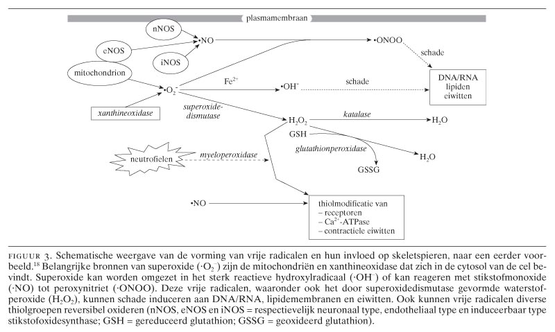Ook reactievezuurstof- en stikstofradicalen spelen een essentiële rol bij de normale skeletspierfunctie. Antioxidantia, die vrije radicalen wegvangen, verminderen in vitro de krachtgeneratie van het diafragma bij dieren.23 Onder bepaalde omstandigheden, zoals overbelasting, kan de productie van vrije radicalen in de spier buitenproportioneel toenemen. Deze zogenaamde oxidatieve stress heeft een negatief effect op de spierfunctie, onder andere leidend tot verhoogde vermoeibaarheid.24 Overproductie van vrije radicalen resulteert in een verstoring van de intracellulaire calciumhomeostase,25 wat kan leiden tot spierschade door activatie van calciumafhankelijke proteolytische enzymen of NF-?B. Een schematisch overzicht van de effecten van vrije radicalen op de excitatie-contractiekoppeling is weergeven in figuur 3.