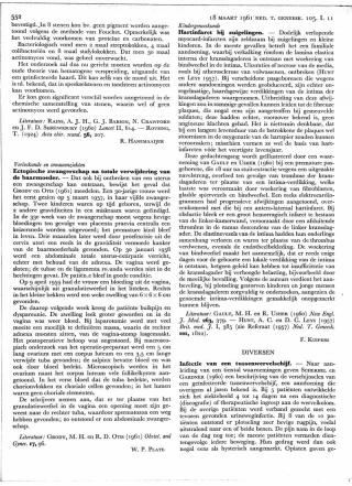 Dit artikel is alleen beschikbaar als PDF.Lees de PDF Artikelinformatie Online verschenen op 4 februari 1961 Citeer dit artikel als Ned Tijdschr Geneeskd. 1961;105:552 Heb je nog vragen na het lezen van dit artikel? Check onze AI-tool en verbaas je over de antwoorden. ASK NTVG Ook interessant Onderzoek Over den invloed van de verwijdering der baarmoeder op de inwendige afscheiding van de eierstokken Nieuws Herhaalde, ernstige baarmoederbloeding bij essentieele thrombopenie na miltverwijdering Nieuws Baarmoeder vaker verwijderd bij vrouwen uit lagere sociale klassen Meer gerelateerd … Reacties Login om een reactie te plaatsen