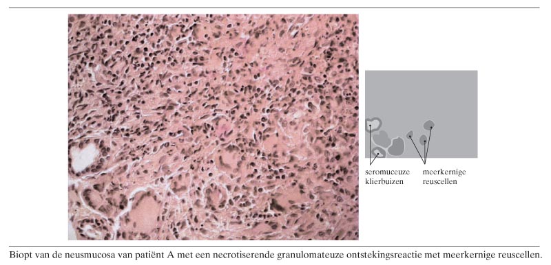 Patiënt A, een man van 42 jaar met in de antecedenten een episode van ischias, excisie van een anale fistel en een sternumfractuur, meldde zich in de winter met een ‘slepende verkoudheid’ bij de huisarts. Hij klaagde over een blijvende hoest. Er waren geen gele fluimen; wel was er af en toe wat hemoptoë. Patiënt had bovendien een otitis media aan het rechter oor met gehoorvermindering. De klachten verminderden niet bij een therapie met azitromycine. Patiënt had last van toenemende algemene vermoeidheid en malaisegevoel. Vervolgens klaagde hij ook over polyartralgieën (vooral aan de knieën, ellebogen, polsen en vingers). De urine was donkergekleurd. Drie dagen na deze bijkomende symptomen werd de patiënt dan ook opgenomen op de dienst Nefrologie. Biochemisch documenteerde men een sterk verhoogde erytrocytensedimentatie en concentratie van C-reactieve proteïne, een lichte nierfunctiebeperking met een serumcreatininewaarde van 130 ?mol/l en cytoplasmatisch gelokaliseerde ANCA (c-ANCA) tegen proteïnase-3 (44 U/ml). Urineonderzoek toonde een glomerulaire hematurie en een proteïnurie van 2 g/24 h.