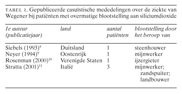Er bestaat reeds heel wat literatuur over de relatie tussen een overmatige blootstelling aan siliciumdioxide en allerlei vormen van nierlijden. Een overzicht hiervan is recent gepubliceerd.7 Grootschalige epidemiologische studies bevestigen de samenhang tussen professionele blootstelling aan siliciumdioxide en chronische nierziekten. Wat betreft de pathogenese verschuift de aandacht steeds meer van een direct nefrotoxisch mechanisme naar een rol van siliciumdioxide als uitlokkende factor voor een auto-immuunreactie. In het kader van deze casus belichten wij hier specifiek de literatuur waarin het vóórkomen van de ziekte van Wegener (een auto-immuunziekte die meestal gepaard gaat met chronisch nierlijden) wordt beschreven bij patiënten die aan siliciumdioxide waren blootgesteld (tabel 1). In Heidelberg vond men onder 5 patiënten met bekende beroepsgerelateerde silicose van de longen die ook aan een systeemziekte leden, één geval van de ziekte van Wegener.8 Uit Oostenrijk kwam een artikel waarin melding werd gemaakt van een mijnwerker met silicose die een typische granulomatose van Wegener kreeg.9 In een studie, opgezet door het Amerikaanse National Institute for Occupational Safety and Health bleek van 583 patiënten met silicose 10 een chronische nierziekte te hebben en in het betreffende artikel wordt specifiek één patiënt met de ziekte van Wegener uitvoerig besproken.10 Deze patiënt was evenals onze patiënt werkzaam geweest in een ijzergieterij. In een Italiaans patiënt-controleonderzoek over vasculitis en nieraantasting werden 6 patiënten met de ziekte van Wegener opgenomen van wie er 3 duidelijk professioneel waren blootgesteld aan siliciumdioxide.11