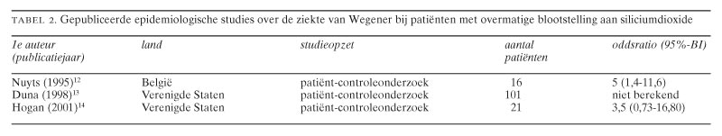 Zoals bekend bewijzen zelfs suggestieve casuïstische mededelingen nog niet een causaal verband. Er zijn echter ook reeds enkele epidemiologische studies gepubliceerd (tabel 2). Een Belgische studie met 16 patiënten en 32 controlepersonen toonde een opvallende samenhang tussen de ziekte van Wegener en beroepen als mijnwerker, kasseilegger, zandspuiter en constructiearbeider.12 Ook graanstof bevat veel siliciumdioxide, hetgeen het verhoogde risico bij landbouwers zou kunnen verklaren. De oddsratio voor blootstelling bedroeg 5 (95-BI: 1,4-11,6) voor siliciumdioxide en zelfs 6,5 (95-BI: 1,3-13,5) voor alle siliciumbevattende producten. In een Amerikaanse epidemiologische studie bij 101 patiënten met de ziekte van Wegener werd aan de hand van een algemene vragenlijst de blootstelling aan ingeademende stoffen gepeild.13 In deze studie werd bij patiënten een grotere professionele blootstelling aan constructiematerialen vastgesteld (30,7) dan bij een groep gezonde controlepersonen (18,5). In de Verenigde Staten werd ook een patiënt-controleonderzoek uitgevoerd bij 292 patiënten met zogenaamde ANCA-geassocieerde vasculitis of lupus erythematodes disseminatus (SLE), waarbij specifiek aandacht werd besteed aan siliciumdioxide.14 De subgroep van patiënten met de ziekte van Wegener bestond uit 21 personen; bij hen werd een oddsratio van 3,5 (95-BI: 0,73-16,80) vastgesteld voor blootstelling aan siliciumdioxide, terwijl de oddsratio voor deze blootstelling bij alle patiënten met ANCA samen 4,43 (95-BI: 1,36-14,38) bedroeg. De subgroepen met ANCA tegen proteïnase-3 en tegen myeloperoxidase, componenten van de granula van neutrofiele granulocyten, vertoonden beide een verhoogd risico van blootstelling aan siliciumdioxide.