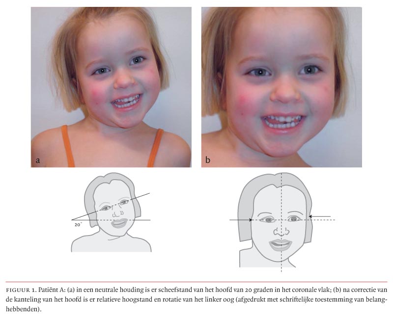 Wij zagen een meisje met een torticollis. Anamnestisch was er overdag geen pijn. Bij het slapen in een verkeerde houding werd patiëntje echter wakker met pijn in de hals. Bij lichamelijk onderzoek zagen wij een evidente scheefstand van het hoofd. In het aangezichtsvlak had het meisje in neutrale houding ruim 20 graden scheefstand (figuur 1a). Hierbij viel op dat het linker oog hoger stond dan het rechter oog. Tevens was de as van de oogspleet gekanteld ten opzichte van de andere zijde (zie figuur 1b).