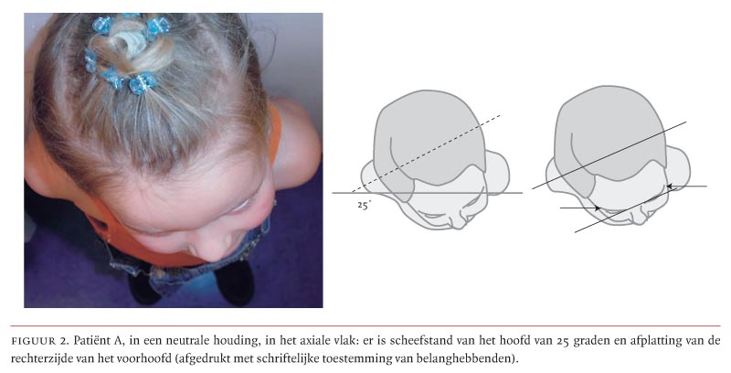 Patiënt A, een 4-jarig meisje, zagen wij op de polikliniek Orthopedie in verband met een toenemende scheefstand van het hoofd. Volgens de moeder was tijdens de bevalling fors gemanipuleerd met het hoofd en de schouder. Na enkele weken werd een scheefstand van het hoofd bemerkt. De huisarts had het kind verwezen naar een fysiotherapeut en een orthomanueel therapeut, die regelmatig bewegingsoefeningen toepasten. Na 1 jaar was deze behandeling gestaakt.