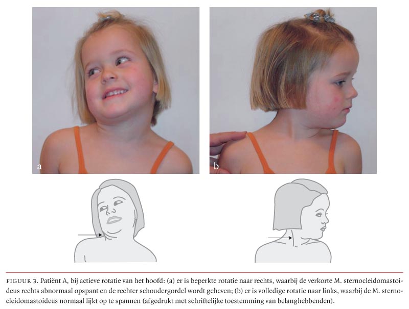 Bij lichamelijk onderzoek zagen wij dat het kind het grootste deel van de tijd naar links keek. Het gelaat vertoonde geen asymmetrie. Bij actief en passief bewegen was de rotatie van de hals naar rechts afgenomen. Een compensatoire beweging van de torso werd gezien bij het kijken naar rechts. Bij palpatie was een vast elastische zwelling voelbaar in de rechter M. sternocleidomastoideus.