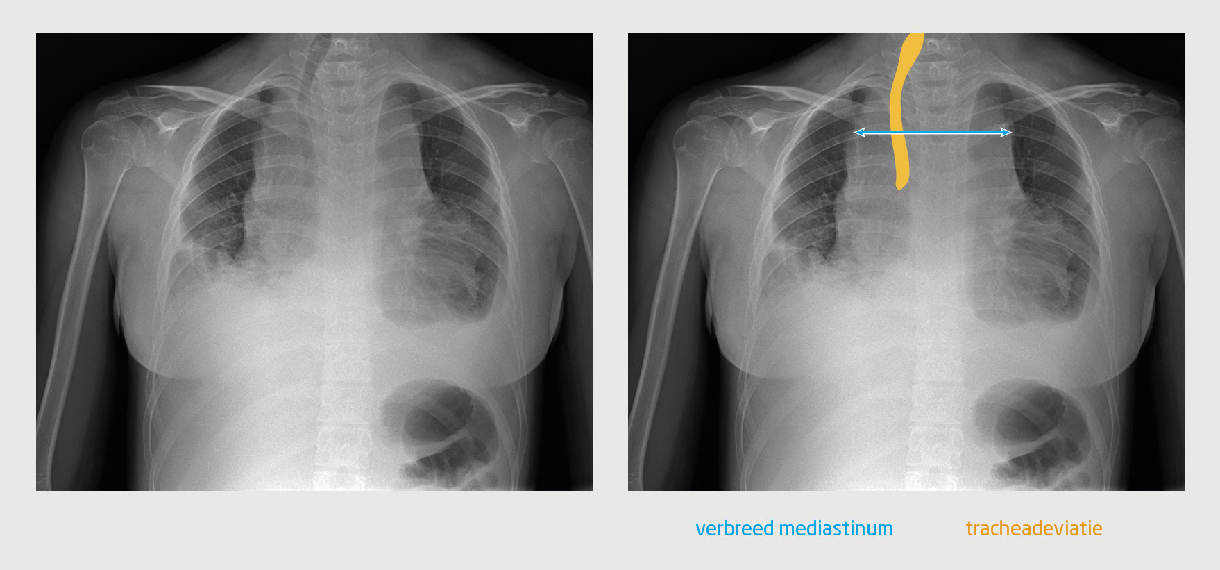 Aldaar werd een benauwd meisje gezien die in korte zinnen sprak. Er was sprake van neusvleugelen, orthopneu en oedeemvorming in het gelaat. De halsvaten waren gestuwd. Bij lichamelijk onderzoek palpeerde de anios kindergeneeskunde fors vergrote cervicale en supraclaviculaire lymfeklieren. Bij auscultatie van de longen hoorde zij bronchiaal en rechts basaal ook verminderd ademgeruis. De lever was 3 cm onder de ribbenboog palpabel. Omdat de zuurstofsaturatie daalde naar 93%, kreeg patiënte zuurstof toegediend. De röntgenfoto van de thorax toonde een fors verbreed mediastinum, waarschijnlijk veroorzaakt door een lymfadenopathie. De trachea was naar rechts verplaatst en beiderzijds was pleuravocht zichtbaar (figuur 1).