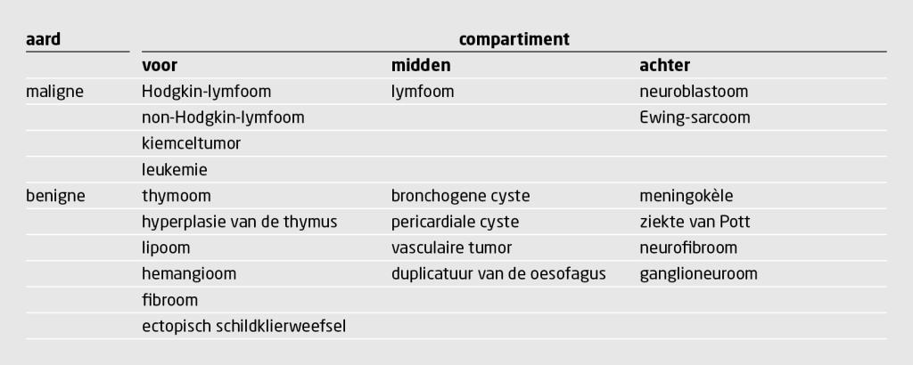 Het mediastinum bestaat uit 3 compartimenten (figuur 2).1 Het voorste mediastinum bevat de thymus, lymfklieren, vet en de V. brachiocephalica sinistra. Het middelste mediastinum bevat de trachea, de carina, de oesophagus, lymfeklieren, de grote vaten en het hart. Het achterste mediastinum bevat de thoracale wervelkolom en paravertebrale weke delen. Bij kinderen is de oorzaak van een verbreed mediastinum meestal gelegen in het voorste mediastinum. Vaak gaat het om een maligniteit. Een uitgebreid overzicht van de oorzaken van een verbreed mediastinum bij kinderen staat in de tabel.