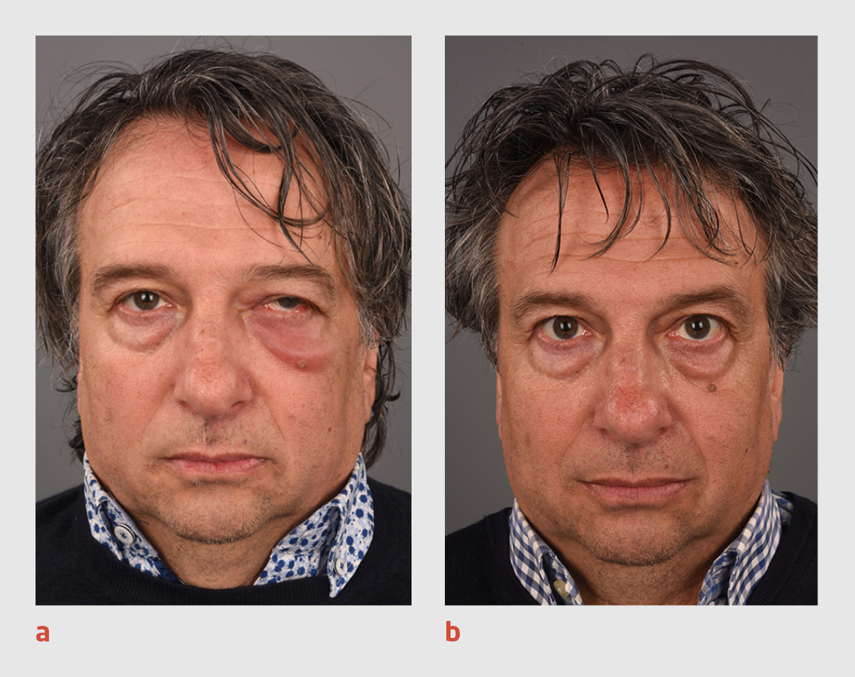 Patiënt, een 53-jarige man bekend met hypertensie, had sinds enkele dagen klachten van het linker oog. Hij kon het linker oog minder goed bewegen; met name de abductie en elevatie waren beperkt. Daarbij had hij een zwelling van het onderooglid, diplopie, neusobstructieklachten en rinorroe. Differentiaaldiagnostisch dacht de huisarts aan pre- of postseptale cellulitis, waarbij een postseptale cellulitis het waarschijnlijkst was gezien de beperkte oogbewegingen en diplopie. De patiënt werd daarom verwezen naar de oogarts. Bij het oogheelkundig onderzoek waren de pupillen isocoor en zij reageerden symmetrisch goed op licht. De oogarts stelde vast dat er sprake was van een postseptale cellulitis van het linker oog. De kno-arts werd geconsulteerd en deze constateerde een pussige rinorroe aan de linkerzijde. De kno-arts concludeerde dat een sinusitis de oorzaak was van de orbitale cellulitis. De patiënt kreeg orale antibiotica voorgeschreven, namelijk amoxicilline/clavulaanzuur 825/125 mg 3 dd. Daarnaast werd de patiënt behandeld met neusspoeling met een NaCl-oplossing en xylometazolineneusspray 1 mg/ml 3 dd.