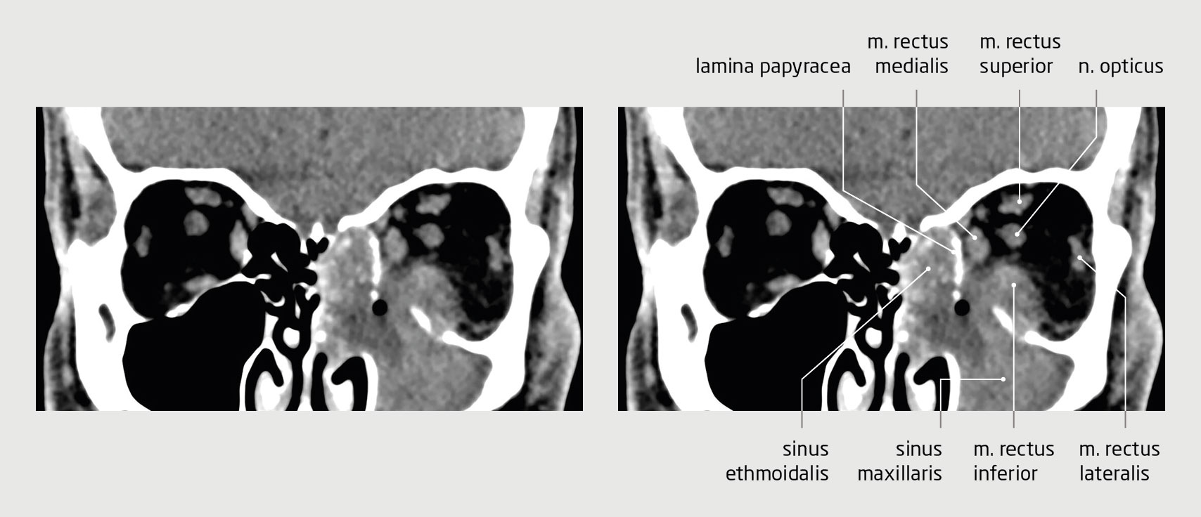 Bij onze patiënt werd bij de eerste CT-scan alleen de orbita afgebeeld. Als hierbij ook de maxilla inclusief de bovenelementen en sinussen afgebeeld waren, was de oorzaak waarschijnlijk eerder aan het licht gekomen.