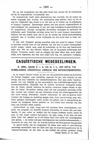 Dit artikel is alleen beschikbaar als PDF.Lees de PDF Artikelinformatie Online verschenen op 25 maart 1907 Citeer dit artikel als Ned Tijdschr Geneeskd. 1907;51:1393-5 Heb je nog vragen na het lezen van dit artikel? Check onze AI-tool en verbaas je over de antwoorden. ASK NTVG Ook interessant Nieuws Dubbelzijdig ontbreken der eerste bovenmolaren bij Macacus Nemestrimus Casuïstiek Een geval van dubbelzijdige tubairzwangerschap Nieuws Linguale wortelverdubbeling bij de bovenkaakmolares Meer gerelateerd … Reacties Login om een reactie te plaatsen