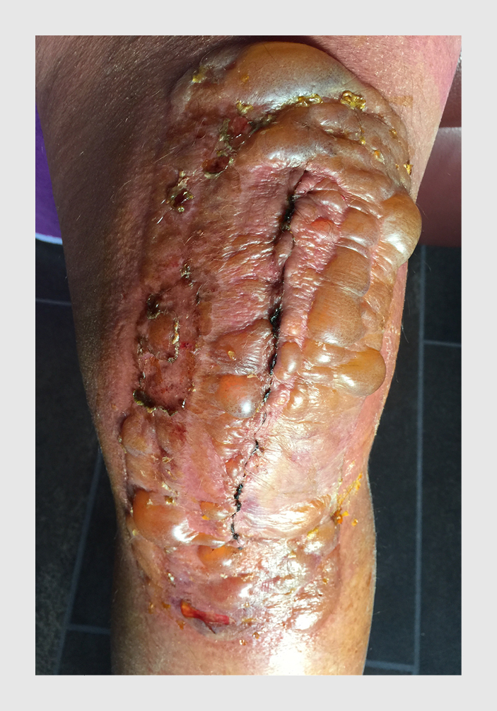 Een 62-jarige man bij wie 4 dagen eerder een knieprothese was geplaatst, kwam op de polikliniek Orthopedie vanwege jeuk en blaren rond de operatiewond. Bij navraag had patiënt in het verleden een huidreactie op witte pleisters gehad. Bij lichamelijk onderzoek zagen wij een vitale man met een scherp begrensd erytheem rond de operatiewond op de knie, met bullae en crustae op de plaats waar het hydrocolloïd wondverband had gezeten (figuur). Wij zagen geen tekenen van een infectie van de wond. Op basis van het klinische beeld dachten wij aan een contactallergie. Andere diagnoses achtten wij minder waarschijnlijk; de lokalisatie en de leeftijd van patiënt pasten niet bij impetigo bullosa en omdat patiënt geen koorts en malaiseklachten had, was bulleuze erysipelas niet waarschijnlijk. Wij verrichtten epicutaan allergologisch onderzoek met de Europese standaardreeks. Omdat de producent van het wondverband geen inzage gaf in de bestanddelen van hun product en de Europese standaardreeks mogelijk niet alle allergenen bevatte, testten wij ook het wondverband. Het onderzoek liet positieve reacties zien op colofonium, perubalsem, parfummix II en het wondverband. Wij adviseerden patiënt om contact met de betreffende stoffen te vermijden. Wij verbonden het wondgebied met jodiumhoudende gazen, waarna de wond snel genas.