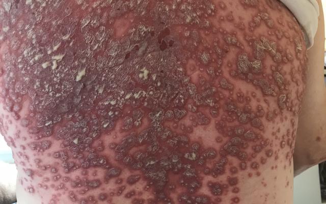 Een 73-jarige man bezocht de SEH, omdat hij sinds 2 dagen last had van een progressieve, jeukende huiduitslag. Hij gebruikte sinds 10 dagen hydroxychloroquine vanwege reumatoïde artritis. Bij lichamelijk onderzoek zagen wij een niet-zieke man met koorts (39°C), diffuus erytheem en vele pustels verspreid in het gelaat, op de bovenzijde van de romp en – in mindere mate – op de extremiteiten (figuur). Laboratoriumonderzoek toonde een verhoogde CRP-concentratie, een leukocytose en een neutrofilie. Histopathologisch onderzoek van een huidbiopt toonde subcorneale pustels die gevuld waren met neutrofiele granulocyten, enige spongiose, papillair oedeem en extravasatie van erytrocyten zonder psoriasiforme hyperplasie. Wij…