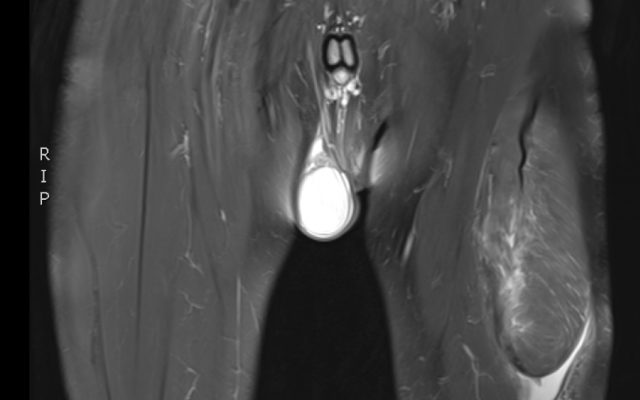Een 49-jarige man met een blanco voorgeschiedenis bezocht de polikliniek Orthopedie vanwege een pijnlijke zwelling van zijn linker bovenbeen. De zwelling was 10 dagen geleden acuut ontstaan tijdens het zaalvoetballen, na een harde trap tegen de grond. Met name traplopen was pijnlijk. Ondanks frequent gebruik van ijskompressen, nam de zwelling niet af. Bij lichamelijk onderzoek zien wij aan de voorzijde van het bovenbeen een prominente zwelling die gevoelig is bij aanraking (figuur a). De zwelling had een glad aspect, was goed afgrensbaar en lag los van de huid, maar zat vast aan de onderlaag. De kracht van de M…