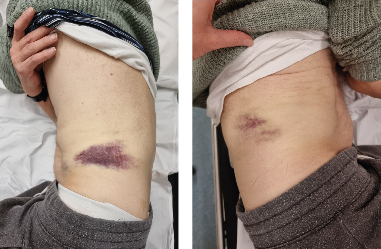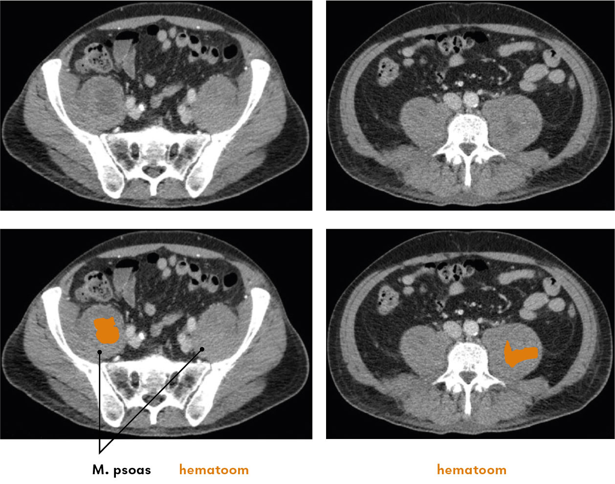 Een 66-jarige man werd naar de SEH gebracht wegens pijn in de liezen en onderbuik sinds enkele dagen; hij lag met opgetrokken benen op de brancard. De pijn was spontaan begonnen en hij had geen gastro-intestinale klachten of mictieklachten. De voorgeschiedenis vermeldde een mechanische aortaklepvervanging, een liesbreukcorrectie en recent een pneumonie. Hij gebruikte onder andere fenprocoumon. De parameters voor vitale functies waren niet afwijkend. Opvallend waren ecchymosen in beide flanken (figuur 1). De darmperistaltiek was normaal, het abdomen was soepel en palpatie van onderbuik en liezen was pijnlijk. Verdere flexie van beide heupen tegen weerstand veroorzaakte toename van pijn (beiderzijds positief psoasteken). Laboratoriumonderzoek liet een normocytaire anemie zien met een Hb van 5,6 mmol/l, een INR van 5,9 en een CRP van 30 mg/l.