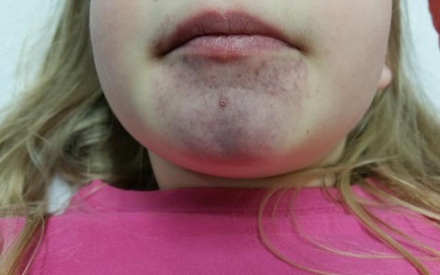 Een meisje van 9 jaar bezocht binnen enkele weken meerdere keren het spreekuur van de huisarts in verband met een paarsblauwe verkleuring van haar kin en, in mindere mate, haar bovenlip. Deze verkleuringen verdwenen weer spontaan in enkele dagen. Behalve de zichtbare verkleuring had zij verder geen klachten en ze oogde gezond. Zij was niet ziek geweest en gebruikte geen medicatie. Bij lichamelijk onderzoek was er sprake van een scherp begrensd, niet wegdrukbaar erytheem op met name de kin en de bovenlip, klinisch passend bij purpura. Oriënterend laboratoriumonderzoek was niet afwijkend. Bij navraag bleek dat zij steeds voordat de…