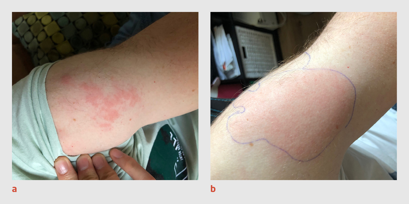 Een 41-jarige man kwam bij een GGD-vaccinatielocatie met een rode, gezwollen en jeukende huidafwijking op zijn linker arm. Deze afwijking was 1 week na het ontvangen van zijn eerste Moderna-vaccin ontstaan en hield al ongeveer 5 dagen aan. Tussentijds was hij door de huisarts behandeld met flucloxacilline wegens verdenking op cellulitis.