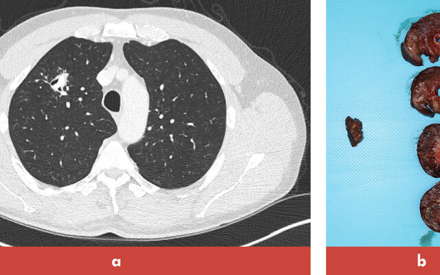 Op de polikliniek Longziekten zagen we een 30-jarige man wegens hoesten, dyspneu en vermoeidheid sinds een paar weken. Patiënt heeft 5 pakjaren gerookt en rookte nog steeds. Bij lichamelijk onderzoek en laboratoriumonderzoek vonden wij geen afwijkingen. De thoraxfoto toonde nodulaire afwijkingen, diffuus verspreid over beide longen (figuur 1). Aanvullend werd een CT-thorax verricht waarop diffuus verspreide, deels caviterende noduli over alle longvelden werden gezien (figuur 2). Bronchoscopie leverde geen diagnose op. Omdat de differentiaaldiagnose nogal uitgebreid was en de patiënt snel duidelijkheid wilde, onderging hij een video-geassisteerde thoracoscopie (VATS) met wigresectie van de linker bovenkwab. Histopathologisch onderzoek liet scherp…