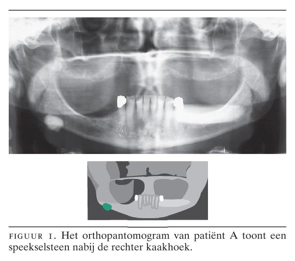 Patiënt A, een 51-jarige man, wordt verwezen wegens een recidiverende, pijnlijke zwelling onder de rechter kaakhoek die vooral optreedt vlak vóór en tijdens de maaltijden. Patiënt is bekend wegens hypertensie en de ziekte van Ménière en gebruikt als medicatie captopril, ibuprofen en betahistine. Bij klinisch onderzoek is de glandula submandibularis rechts vergroot, ietwat palpatiepijnlijk en voelt deze vast elastisch aan. In de hals zijn geen lymfklieren palpabel. Massage van de klier veroorzaakt een geringe hoeveelheid putride afvloed uit het orificium van de ductus submandibularis. Bij intraoraal onderzoek wordt achter de achterrand van de M. mylohyoideus een ongeveer 2 cm grote, harde weerstand gepalpeerd. Het orthopantomogram toont een radiopake structuur nabij de kaakhoek; het beeld past bij dat van een speekselsteen in het proximale deel van de ductus submandibularis (figuur 1). De speekselsteen wordt transoraal onder algehele anesthesie verwijderd. Na de ingreep treden geen klachten meer op.