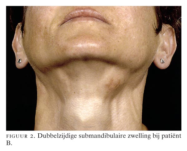 Patiënt B, een 34-jarige vrouw, wordt verwezen met een sinds enkele maanden bestaande dubbelzijdige submandibulaire zwelling (figuur 2). Zij ondervindt hier geen klachten van. Patiënte is gezond en gebruikt geen medicijnen. Zij heeft ondergewicht; in het verleden is zij psychiatrisch behandeld wegens een psychogene eetstoornis. De beide submandibulaire speekselklieren voelen vergroot en vast elastisch aan. Behoudens deze zwellingen worden in de hals en de mondbodem geen afwijkingen gepalpeerd. Bij massage van de submandibulaire speekselklieren is er secretie van helder speeksel. Cytologisch onderzoek van het aspiraat van de linker zwelling levert niet-afwijkende speekselkliercellen op. Bij navraag blijkt dat patiënte nog steeds lijdt aan anorexia dan wel boulimia. Het beeld past bij sialoadenose van de glandulae submandibulares op basis van anorexia dan wel boulimia. Aanvullende diagnostiek van de zwellingen werd niet zinvol geacht. Patiënte werd voor behandeling van haar eetstoornis verwezen naar de psychiater.