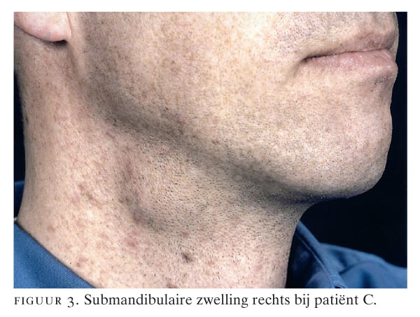 Patiënt C, een 32-jarige man met een blanco voorgeschiedenis, wordt verwezen wegens een sinds ongeveer 6 maanden bestaande submandibulaire zwelling rechts (figuur 3). Hij ondervond hiervan geen klachten, maar werd door zijn omgeving geattendeerd op de zwelling. Bij onderzoek wordt een ongeveer 2,5 cm grote, elastisch aanvoelende zwelling gepalpeerd onder de kaakhoek. In de hals zijn geen pathologische lymfklieren palpabel. Intraoraal onderzoek levert geen bijzonderheden op en bij massage van de rechter glandula submandibularis is er afvloed van helder speeksel. Het orthopantomogram en de occlusale röntgenfoto tonen geen afwijkingen (bij een occlusale röntgenfoto ligt de film tegen het occlusale vlak en wordt de bundel röntgenstraling loodrecht op de film gericht). Cytologisch onderzoek van een aspiraat van de afwijking leidt tot de diagnose ‘pleiomorf adenoom’. Onder algehele anesthesie wordt de tumor verwijderd door middel van een suprahyoïdale uitruiming. Bij histologisch onderzoek blijkt het inderdaad te gaan om een pleiomorf adenoom van de glandula submandibularis, dat totaal is verwijderd. Bij controle na twee jaar worden geen afwijkingen geconstateerd.