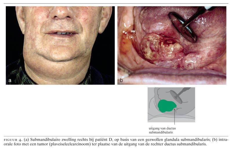 Patiënt D, een gezonde man van 74 jaar, wordt naar de chirurg verwezen wegens een submandibulaire zwelling rechts (figuur 4a). Behoudens deze zwelling werden in de hals geen afwijkingen gepalpeerd. Cytologisch onderzoek van een aspiraat uit de afwijking levert als uitslag ‘speekselklierontsteking’ op. Patiënt wordt verwezen naar de kaakchirurg. Bij intraoraal onderzoek bevindt zich in het ventrale deel van de rechter mondbodemhelft een afwijking die doet denken aan een plaveiselcelcarcinoom en die door patiënt zelf niet was opgemerkt (zie figuur 4b). Onderzoek van een incisiebiopt bevestigt de klinische diagnose. CT-onderzoek toont behoudens de vergrote rechter glandula submandibularis geen andere afwijkingen, in het bijzonder geen vergrote lymfklieren. De zwelling van de glandula submandibularis wordt veroorzaakt door belemmering van speekselafvloed door de tumor. De behandeling bestaat uit chirurgische verwijdering van de tumor in continuïteit met een dubbelzijdige supra-omohyoïdale halsklierdissectie. Bij histologisch onderzoek blijkt de tumor in zijn geheel verwijderd. In het halsklierdissectiepreparaat wordt 1 kleine, intranodale lymfkliermetastase aangetroffen op lymfklierniveau IB rechts (submandibulaire gebied). Bij controle na 4 jaar zijn er geen aanwijzingen voor een recidief.