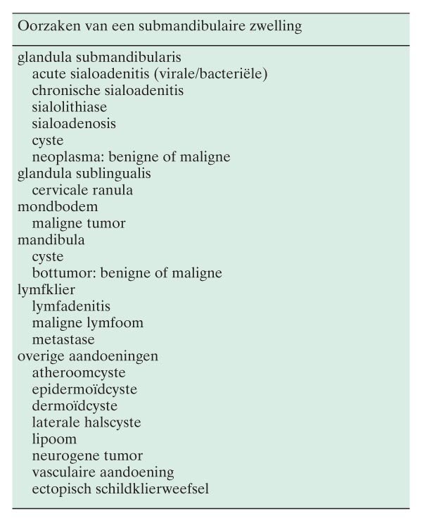 Wanneer een patiënt zich presenteert met een submandibulaire zwelling, ligt het voor de hand aan een aandoening van de glandula submandibularis te denken. Die kan het gevolg zijn van obstructie van de ductus submandibularis door een tumor in de mondbodem. Een submandibulaire zwelling kan echter ook berusten op een vergrote lymfklier. Het onderscheid tussen een vergrote speekselklier of een vergrote lymfklier is klinisch soms moeilijk. Lymfadenopathie kan een uiting zijn van een intraoraal gelegen proces, bijvoorbeeld een ontstoken gebitselement of metastase van een mondbodem- of tongcarcinoom, of kan worden veroorzaakt door ziekten zoals kattenkrabziekte, toxoplasmose, (atypische) tuberculose en sarcoïdose. Ook kan het gaan om een maligne lymfoom. Differentiaaldiagnostisch dient men tevens te denken aan een cervicale ranula (‘plunging’ ranula). Een cervicale ranula is een muceuze pseudo-cyste van de glandula sublingualis, waarbij het geëxtravaseerde speeksel zich door de M. mylohyoideus in de hals heeft uitgebreid en een submandibulaire zwelling veroorzaakt. Geurts et al. schreven recent hierover in dit tijdschrift.8