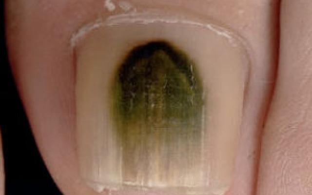 Een 50-jarige vrouw kwam bij de huisarts met een groene verkleuring van de linker hallux (figuur a en b). Deze verkleuring had zij bemerkt nadat ze nagellak had verwijderd. Zij vond de afwijking cosmetisch storend; verder had zij geen klachten. De groene kleur wees op een infectie van het nagelbed met Pseudomonas aeruginosa. Een kweek liet inderdaad groei zien van deze aerobe, gramnegatieve bacterie; er werden geen schimmels gevonden. Patiënte had een vorm van chloronychia (‘green nail syndrome’). Infecties van het nagelbed met Pseudomonas kunnen variëren van enkel een groene verkleuring van de nagel tot vergevorderde onycholyse met…