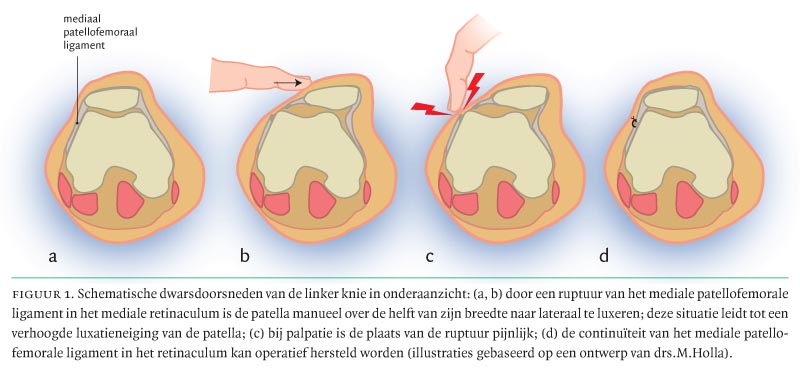 Patiënt A, een 20-jarige mannelijke voetballer, krijgt een trap tegen de binnenzijde van zijn linker knie en valt op de grond. Hij houdt zijn knie in gebogen stand en heeft zichtbaar veel pijn. Geconstateerd wordt dat de knieschijf naar lateraal geluxeerd is. Door voorzichtige tractie aan het been wordt getracht de knie te strekken, waarna met een klikkende sensatie de knieschijf op zijn plaats schiet. Op de Spoedeisende Eerste Hulp van een naburig ziekenhuis worden bij onderzoek en aanvullend röntgenonderzoek van het kniegewricht geen afwijkingen waargenomen, behoudens een haemarthros. Patiënt wordt behandeld met een gipsloopkoker voor een periode van 6 weken. Na een fysiotherapeutische behandeling hervat hij zijn sportieve activiteiten. Hij blijft echter pijnklachten houden aan de anterieure zijde van zijn knie en soms heeft hij het gevoel door de knie te zakken. Voor nadere analyse wordt hij naar onze polikliniek verwezen.