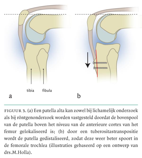 Door een distalisatie van de tuberositas, geïndiceerd bij een patella alta, verandert de sporing van het patellofemorale gewricht. In feite wordt een subluxatiestand van de patella naar proximaal hiermee gecorrigeerd. De resultaten van anatomische reconstructies van het patellofemorale gewricht zijn gunstig en succespercentages tot 96 worden beschreven.21 Indien de tuberositas echter te ver gedistaliseerd wordt, resulteert dit op de langere termijn voor een hoog percentage van de gevallen in patellofemorale artrose.22 23 Ook indien tuberositastransposities worden uitgevoerd bij patiënten met patellofemorale pijn zonder aantoonbare anatomische afwijking zijn de postoperatieve resultaten slecht.13