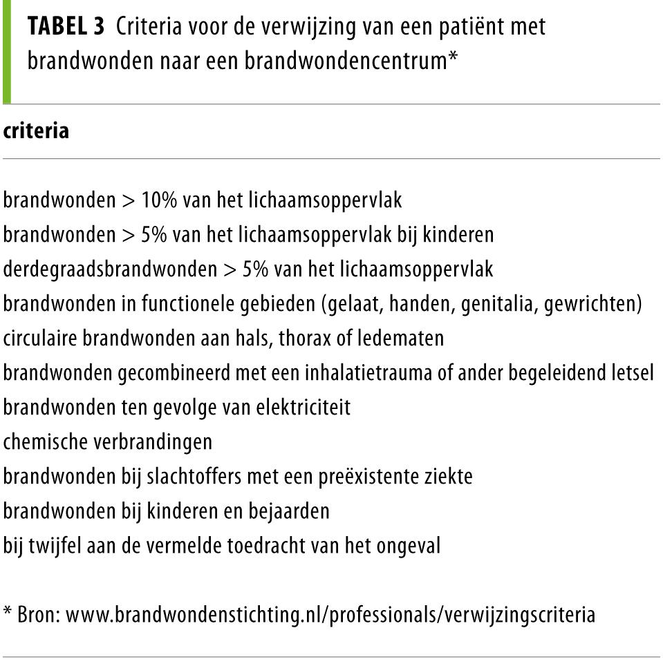 De eerste opvang van een patiënt met brandwonden is een uitdaging voor iedere dokter. De eerste stap is adequaat koelen van een brandwond. Daarna is een zorgvuldige anamnese en een goede eerste beoordeling van essentieel belang voor de behandeling. De brandwond dient regelmatig te worden geïnspecteerd, om de wondgenezing te volgen en een eventuele infectie tijdig te herkennen. Wanneer de wond na 2 weken nog niet is genezen, kan hypertrofische littekenvorming optreden en dient een operatieve behandeling te worden overwogen. Voor overleg over de behandeling van de brandwond, bij infectie van de wond of de overweging over te gaan tot operatie en voor het overplaatsen van een patiënt naar een brandwondencentrum kan altijd contact worden opgenomen met de brandwondencentra in Beverwijk, Rotterdam en Groningen.