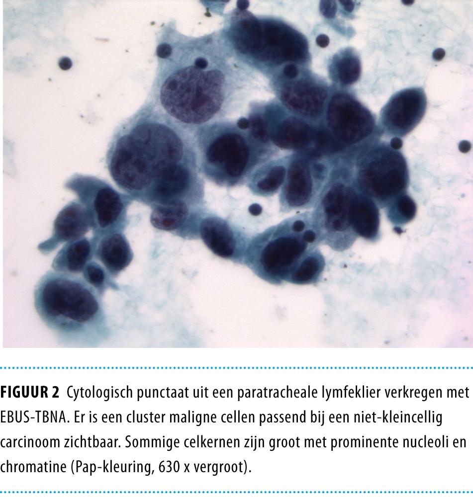 In het kader van de stadiëring bij longcarcinoom ondergingen 77 patiënten EBUS-TBNA. Bij 39 van hen (51%) werden middels EBUS-TBNA mediastinale lymfekliermetastasen aangetoond en kon een mediastinoscopie achterwege gelaten worden. Bij 9 van de 38 patiënten (24%) met benigne cellen bij cytologisch onderzoek of met niet-representatief materiaal bij EBUS-TBNA, werden middels mediastinoscopie of endoscopische ultrasonografie toch lymfekliermetastasen aangetoond. 13 van de 38 patiënten (34%) ondergingen geen aanvullend cytologisch of histologisch onderzoek. De diagnostische opbrengst werd voor 2 scenario's berekend. De sensitiviteit en de negatief voorspellende waarde van EBUS-TBNA bedroegen respectievelijk 64-81% en 42-76%.
