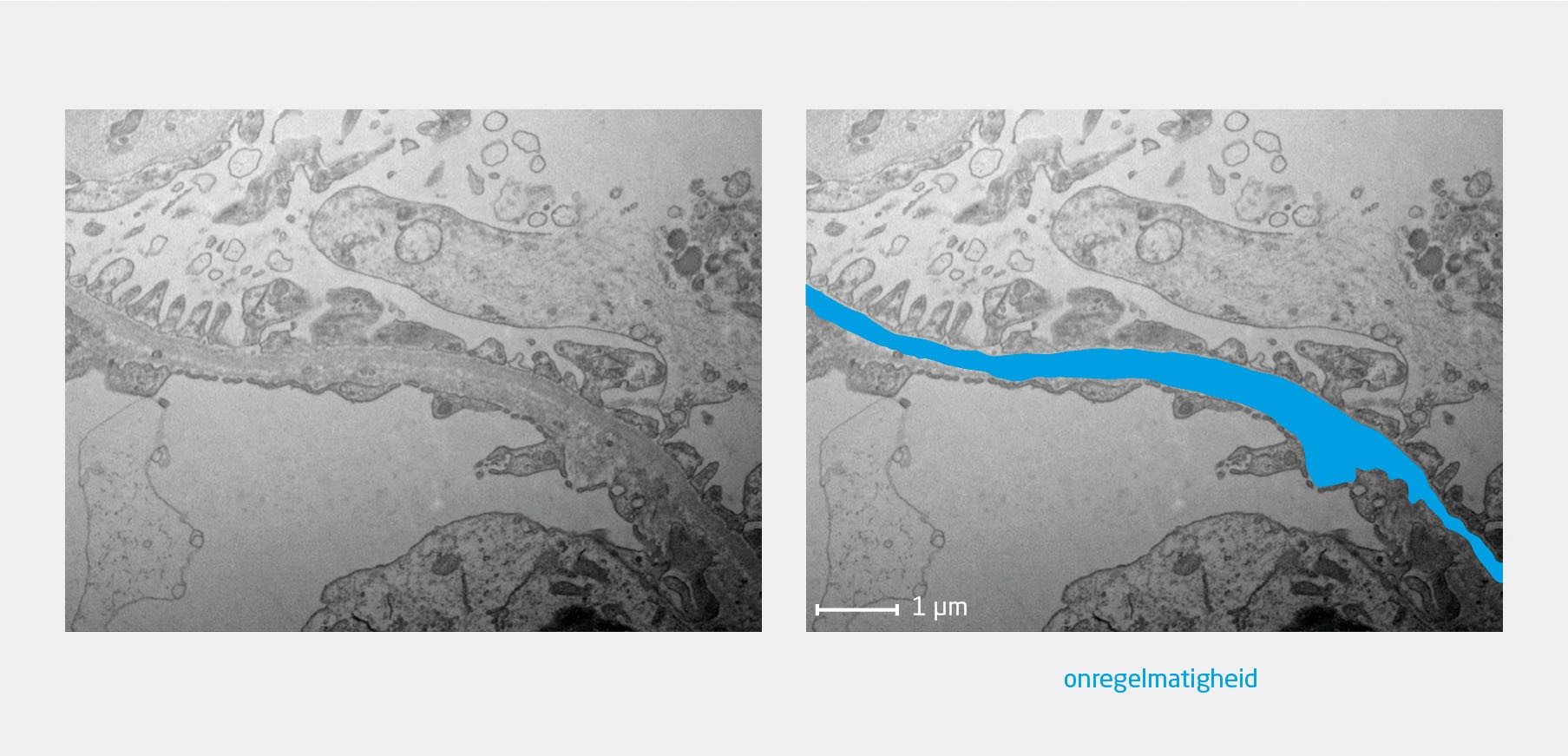 Na enkele jaren verschijnt hij opnieuw op onze polikliniek. Zijn nierfunctie is stabiel gebleven, maar er is nog steeds sprake van hematurie en de proteïnurie is opgelopen tot 6,3 g/g creatinine. Ook hoort patiënt minder goed. Wij nemen een nierbiopt, waarin histopathologisch toename van mesangiale cellen en segmentele glomerulosclerose zijn te zien; immunofluorescentie-onderzoek is negatief. Elektronenmicroscopie toont een wat onregelmatige glomerulaire basaalmembraan met een gelamelleerd aspect, waarbij dunnere en dikkere segmenten elkaar afwisselen (figuur 2). Op basis van het beeld bij elektronenmicroscopie stellen wij de klinische diagnose ‘syndroom van Alport’. Wij bieden patiënt genetisch onderzoek aan, maar hij weigert dit en kan hiertoe niet worden gemotiveerd.