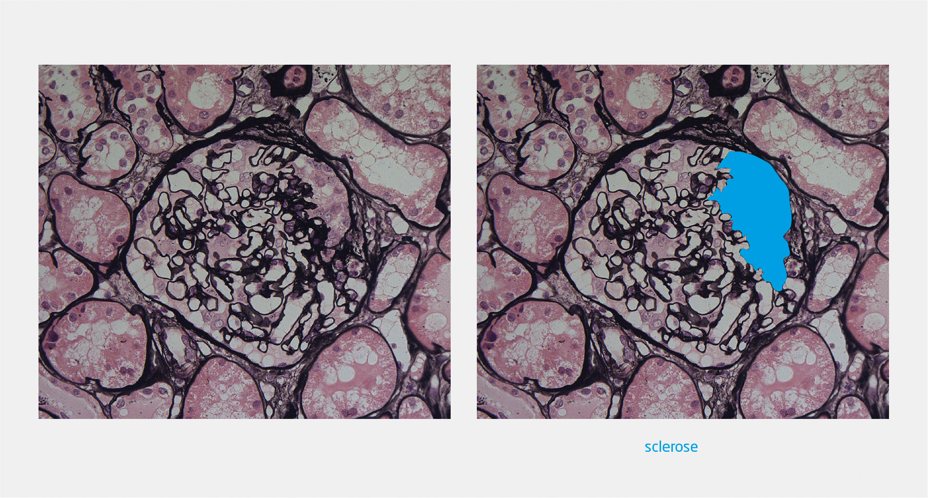 Patiënt C is een man van 55 jaar die al meer dan 20 jaar proteïnurie in de nefrotische ‘range’ (> 3,5 g/24 h) heeft en hypertensie, waarvoor hij al jaren wordt behandeld met een ACE-remmer. Hij komt bij ons wanneer het eindstadium van nierfalen dreigt en hij voorbereid wordt op niertransplantatie. Omdat er nooit een sluitende diagnose is gesteld, reviseren wij het nierbiopt van jaren geleden. Histopathologisch onderzoek toont in meerdere glomeruli segmentele sclerotische afwijkingen, die passen bij de diagnose ‘focale segmentale glomerulosclerose’ (FSGS) (figuur 3).