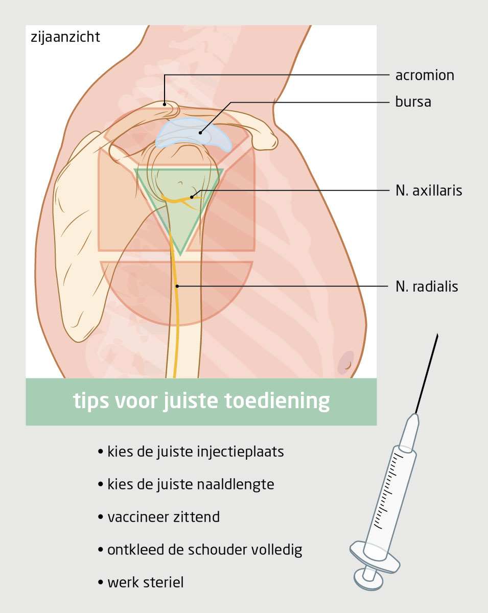 Een bekende oorzaak van SIRVA is het gebruik van een te lange naald; wanneer door de M. deltoideus heen wordt geprikt, kan schade ontstaan aan de onderliggende structuren, zoals de N. axillaris en de subacromiale bursa.1 Daarom moet bij de keuze voor de naaldlengte en de injectieplaats rekening worden gehouden met de lichaamsbouw van de patiënt.5 Te distaal of te lateraal toedienen van de vaccinatie geeft een verhoogd risico op beschadiging van respectievelijk de N. radialis of de N. axillaris.7 Door te proximaal te injecteren (< 2 cm onder het acromion) bestaat de kans dat de injectievloeistof in de bursa subacromialis of het schoudergewricht terechtkomt.6 Dit kan leiden tot irritatie van de spier. Ook kan een bursitis subacromialis ontstaan, die hinderlijke klachten kan geven en kan leiden tot een secundaire ‘frozen shoulder’ (capsulitis adhaesiva).