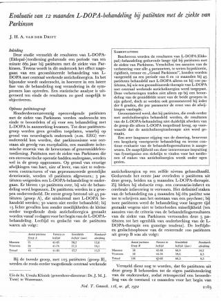 Dit artikel is alleen beschikbaar als PDF.Lees de PDF Artikelinformatie Online verschenen op 12 mei 1972 Citeer dit artikel als Ned Tijdschr Geneeskd. 1972;116:2185-93 Heb je nog vragen na het lezen van dit artikel? Check onze AI-tool en verbaas je over de antwoorden. ASK NTVG Ook interessant Stand van zaken L-DOPA-behandeling bij Parkinson-patiënten Onderzoek Ervaringen met de L-DOPA(Eldopal)-behandeling van 40 patiënten met de ziekte van Parkinson Stand van zaken De behandeling van patiënten lijdende aan de ziekte van Parkinson Meer gerelateerd … Reacties Login om een reactie te plaatsen