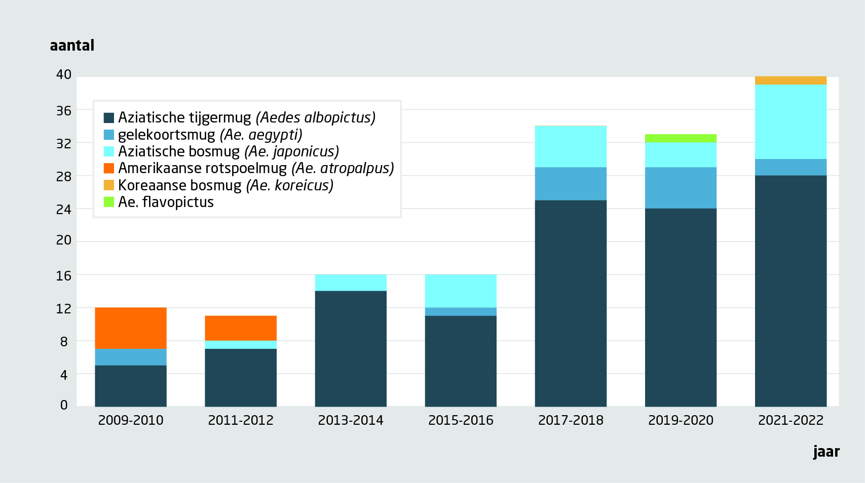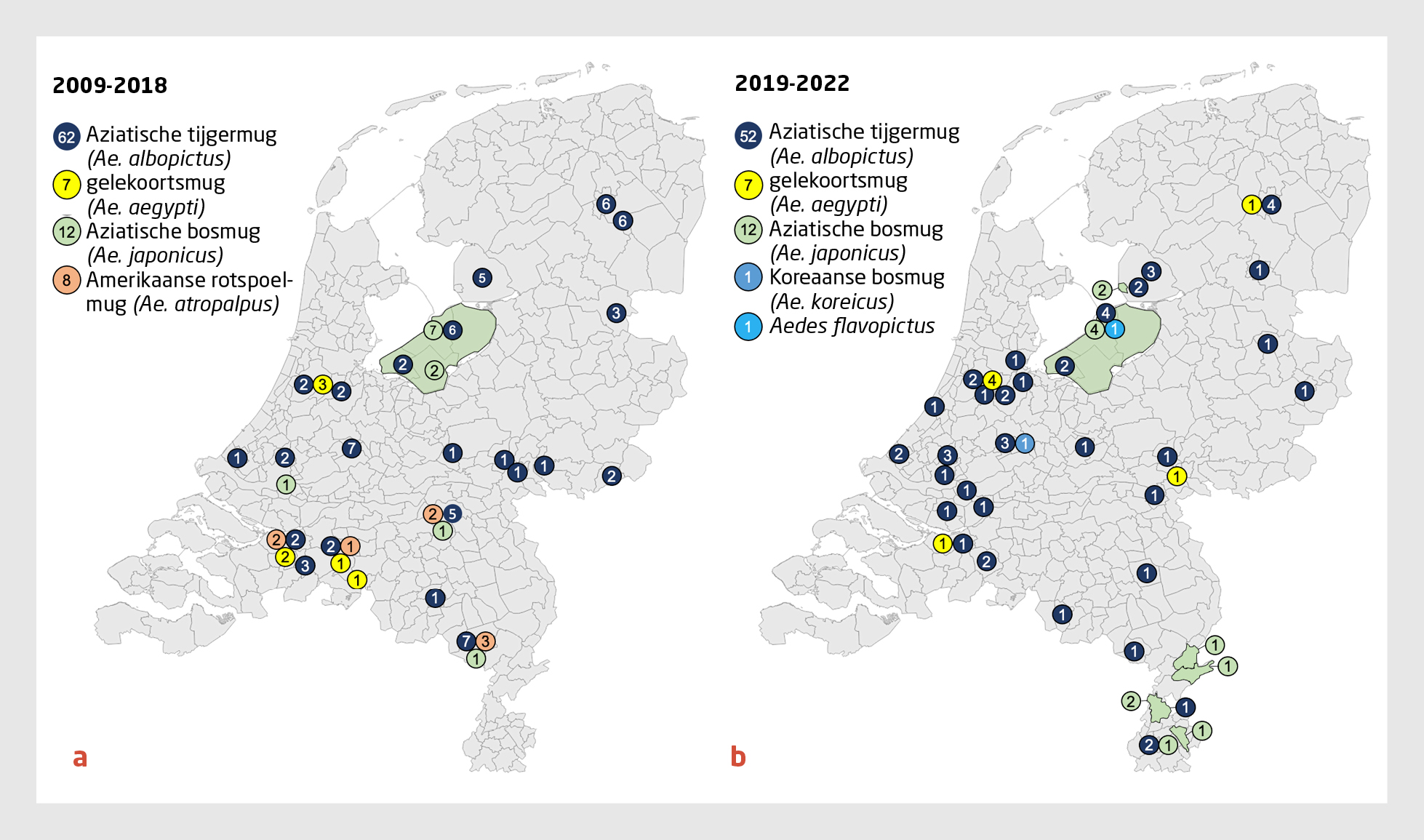 Sinds 2005 zijn er een zestal exotische muggensoorten in Nederland waargenomen. Aanvankelijk waren de waarnemingen vrij sporadisch en betrof het voornamelijk de Aziatische tijgermug (Aedes albopictus).10 Toen de overheid in 2009 intensiever ging bemonsteren, werd duidelijk dat er ook andere soorten geïntroduceerd werden.