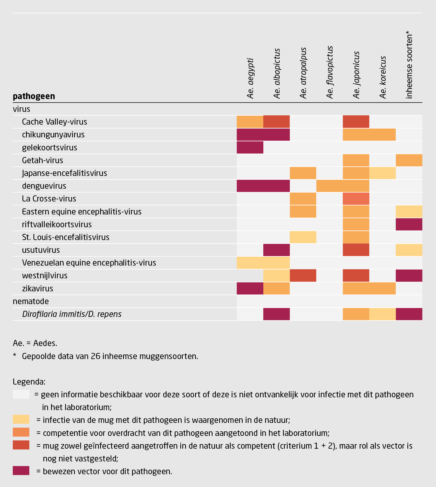 Zoals gezegd verschilt de competentie van exotische muggen voor wat betreft de overdracht van ziekten. De tabel geeft de huidige vectorstatus weer van de 6 in Nederland waargenomen exotische muggen en 26 inheemse muggensoorten voor 15 pathogenen. Dit beeld verandert voortdurend en laat zien dat deze exoten verschillende unieke infectieziekten kunnen overdragen in Nederland. Met uitzondering van het westnijlvirus is vooralsnog onbekend of inheemse muggen een rol spelen bij de transmissie daarvan.