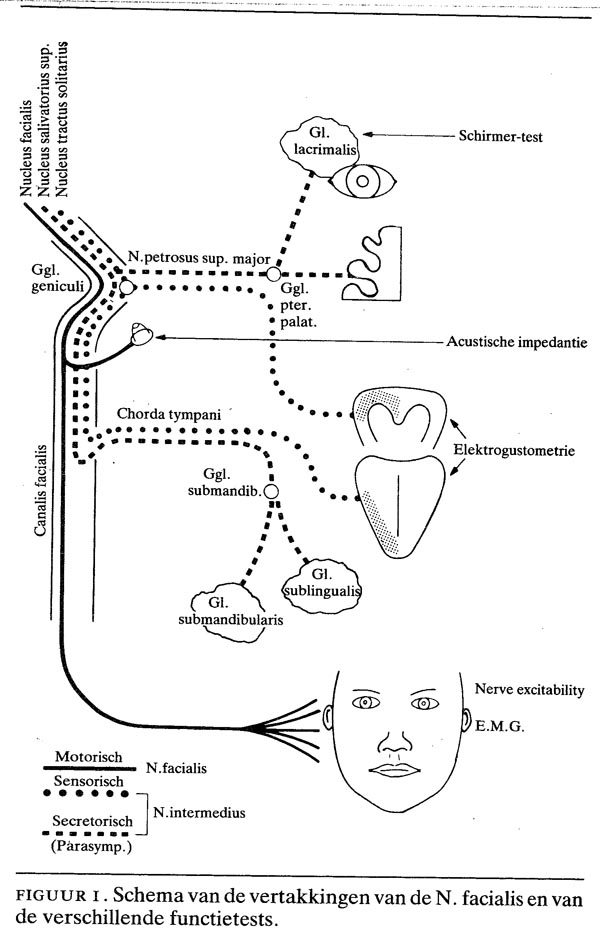Een stoornis in de functie van de N. facialis kan het begin zijn van een blijvende handicap met ingrijpende gevolgen voor het dagelijks leven. De N. facialis (N VII) is een gemengde zenuw waarvan de motorische vezels de mimische musculatuur verzorgen (figuur 1). Het onderzoek van de facialisfuncties ontleent zijn betekenis in de keel-, neus-, oorheelkunde aan het verloop van de zenuw door het rotsbeen, door het binnenoor (tussen evenwichts- en gehoororgaan), door het middenoor en mastoïd en door de glandula parotis.