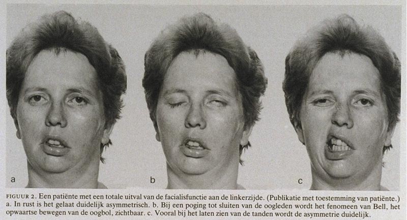 – somatisch: als gevolg van de éénzijdige verlamming ontstaat een ‘scheef’ gelaat en zijn willekeurige en emotionele bewegingen niet meer mogelijk. In de getroffen zijde zijn de rimpels van het voorhoofd verstreken, staat de wenkbrauw lager, is de lidspleet wijder (lagophthalmus), is de nasolabiale plooi verstreken, staat de mondhoek lager en wordt het midden van de mond naar de tegenovergestelde zijde getrokken (figuur 2). Bij een poging tot sluiten van de lidspleet wordt het fenomeen van Bell zichtbaar (de oogbol draait omhoog, hetgeen onder normale omstandigheden niet zichtbaar is). De patiënt heeft last van tranenvloed en er bestaat een grote kans op het krijgen van een conjunctivitis of keratitis. De afhangende wang veroorzaakt moeite met eten en spreken en verlies van speeksel via de afhangende mondhoek.
