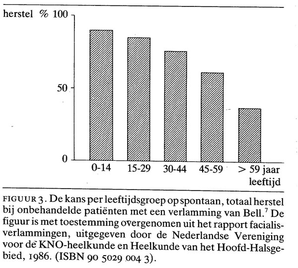 Over de oorzaak bestaat geen zekerheid. Sommige auteurs beschouwen de verlamming van Bell in een aantal gevallen als een onderdeel van een gedeeltelijk subklinisch verlopende polyneuropathie.6 Pathofysiologisch lijkt de theorie van de primaire en secundaire ischemie (door een vicieuze cirkel ontstaat druk op de zenuwvezels) nog steeds aantrekkelijk. De verlamming wordt vooral gezien bij mannen tussen de 30 en 40 jaar. Incidentie van deze verlamming in Nederland: ca. 1 per 5.000 volwassenen en 1 per 20.000 kinderen per jaar. Recidieven worden regelmatig gezien, in dezelfde of in de andere gezichtshelft. Totaal herstel, zonder behandeling, is duidelijk afhankelijk van de leeftijd (figuur 3).7