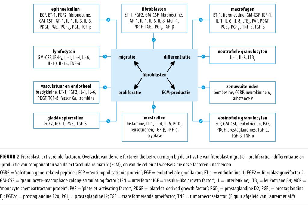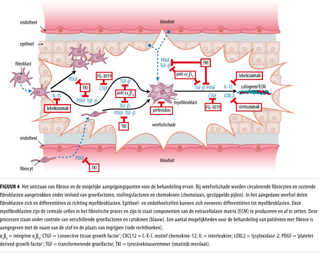 - We beschrijven verschillende nieuwe therapeutische doelwitten (‘targets’), zoals transformerende groeifactor-β, ‘platelet-derived growth factor’, interleukine-13, lysyloxidase-2 en macrofaag-fibroblastinteracties. Deze worden momenteel in preklinische en klinische studies onderzocht.