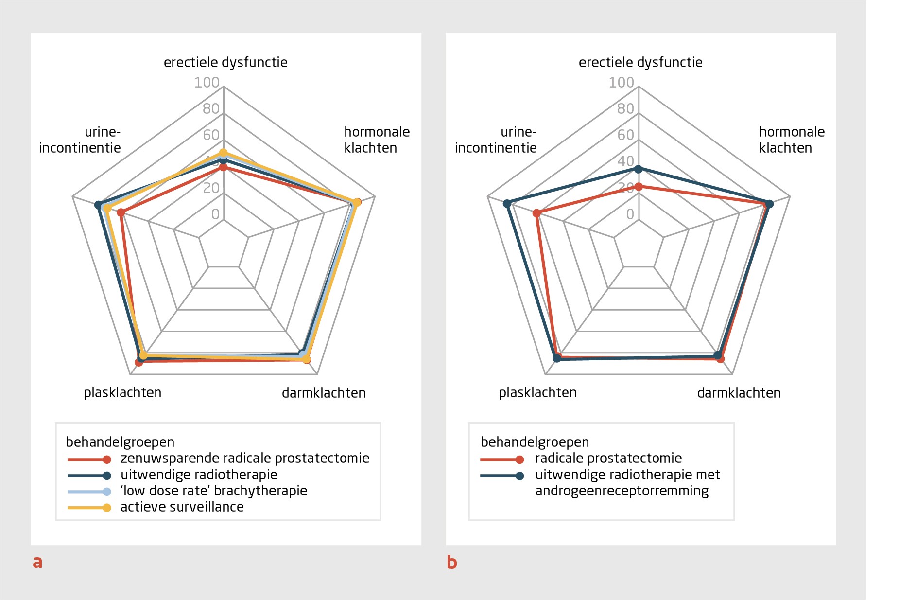 Ziektespecifieke functionele uitkomsten bij gelokaliseerde prostaatkanker met een gunstig (a) of een ongunstig (b) risicoprofiel, 5 jaar na de behandeling. Van de mannen met een gunstig risicoprofiel (klinisch stadium cT1-cT2bN0M0, PSA ≤ 20 ng/ml of Gleason-graad 1-2) ondergingen er in dit onderzoek 675 een zenuwsparende radicale prostatectomie, 261 uitwendige radiotherapie…