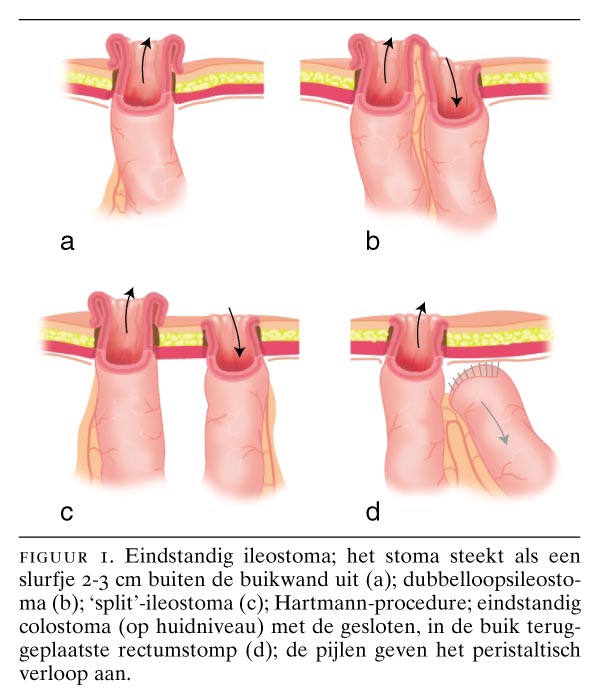 De indicatie voor een dubbelloopsileostoma (zie figuur 1) is bescherming van een colorectale anastomose of het verminderen van complicaties bij een lekkende colorectale anastomose. Een alternatief is een dubbelloopstransversostoma. Het aanleggen van een ‘split’-ileostoma (zie figuur 1) verdient niet de voorkeur, omdat voor continuïteitsherstel een reguliere laparotomie noodzakelijk is.