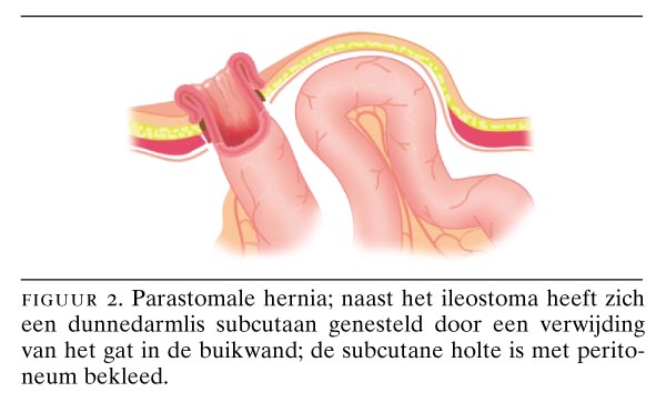 Bij de parastomale hernia (figuur 2) wordt in de subcutis een breukzak gevormd waarin zich omentum, dunne darm en andere delen van het colon kunnen bevinden. De prevalentie ligt tussen de 30 en 50. Vaak is de opening in de buikwand te groot of buiten de rectusschede gesitueerd. Slechte kwaliteit van de buikwand, adipositas en chronisch hoesten zijn eveneens van invloed. Door de herniatie kunnen de stomazakjes loslaten. Vernauwing van het buikwanddefect met hechtingen geeft een recidiefpercentage van 30-80; na correctie met toepassing van een ‘mesh’, een netje van kunststof, daalt dit tot ongeveer 8.32-35 Transpositie naar de andere buikhelft is een goed alternatief.