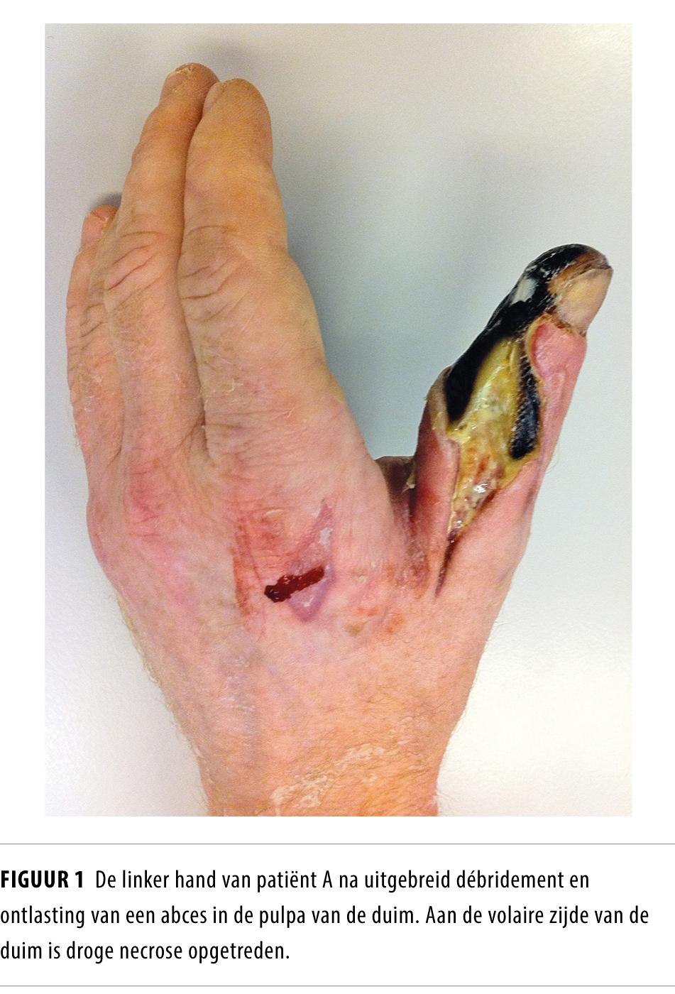 Op grond van de bevindingen bij het lichamelijk onderzoek luidde de diagnose ‘abces in de pulpa’. Met spoed werd patiënt geopereerd om het abces te ontlasten en een uitgebreid débridement van de weke delen uit te voeren. Kweek van pus uit het abces liet groei van hemolytische streptokokken groep A zien. Kort na de drainage ontstond ischemie van de duim met droge necrose van de volaire huid als gevolg (figuur 1).