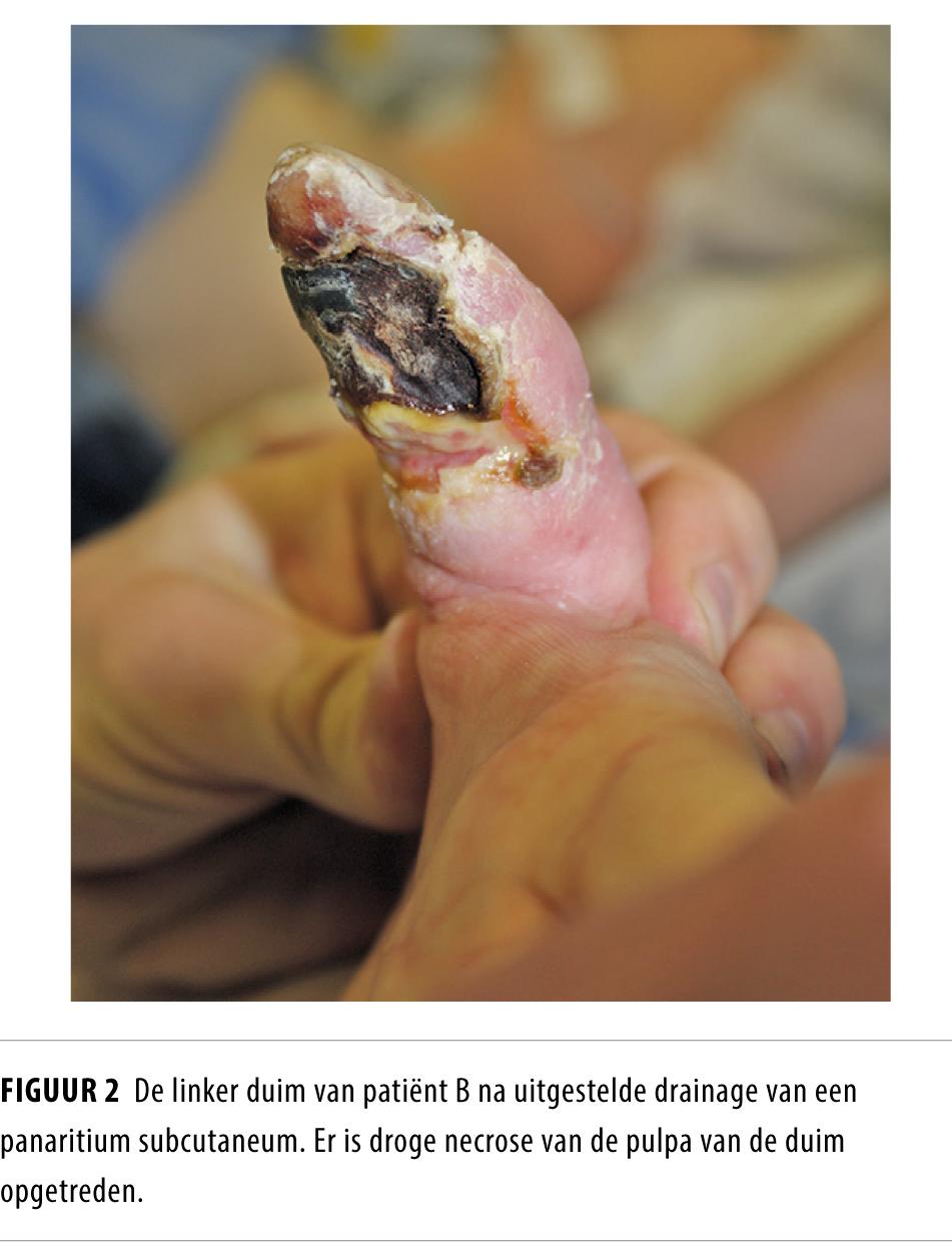 Een inadequaat behandeld panaritium kan invaliderende gevolgen hebben voor de handfunctie van de patiënt, waaronder permanente stijfheid van de aangedane vinger tot partiële amputatie. Kennis van de anatomie, adequaat lichamelijk onderzoek en tijdig ingrijpen – desnoods operatief – zijn essentieel voor een goede behandeling. Tot deze kennis behoort het besef dat de pulpa – de wekedelenbedekking aan de volaire zijde van de distale falanx van een vinger – de eigenschap van een gesloten ruimte heeft. Wij beschrijven het gecompliceerde beloop bij 2 patiënten van panaritium subcutaneum van de duim, dat vanwege uitgebreide necrose uiteindelijk reconstructie van de pulpa noodzakelijk maakte. Het doel van deze klinische les is te wijzen op vroegtijdige herkenning van het panaritium en de juiste behandeling of tijdige verwijzing, om complicaties te voorkomen.