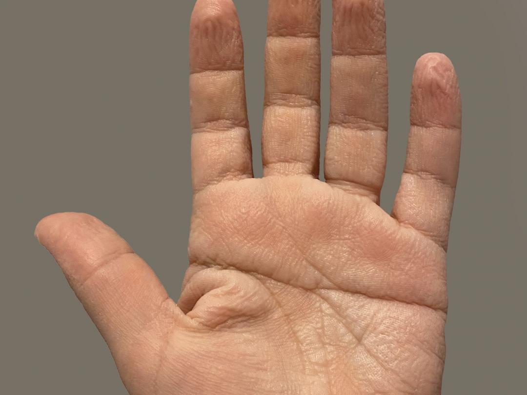 Een 23-jarige vrouw met blanco voorgeschiedenis bezocht de polikliniek Klinische Genetica vanwege zwelling en branderige pijn aan haar handpalmen binnen 5 minuten na contact met water; hier had zij al 7 jaar last van. In beide handpalmen was zwelling, rimpeling van de huid en een witte waas zichtbaar (figuur). De patiënte had zelf de diagnose ‘aquagenic wrinkling of the palms’ op internet gevonden en wilde DNA-diagnostiek naar cystische fibrose. Aquagenic wrinkling of the palms komt voor bij dragers van mutatie(s) in het CFTR-gen, dat codeert voor ‘cystic fibrosis transmembrane conductance regulator’. De patiënte bleek homozygoot voor de R117H-7T-mutatie…