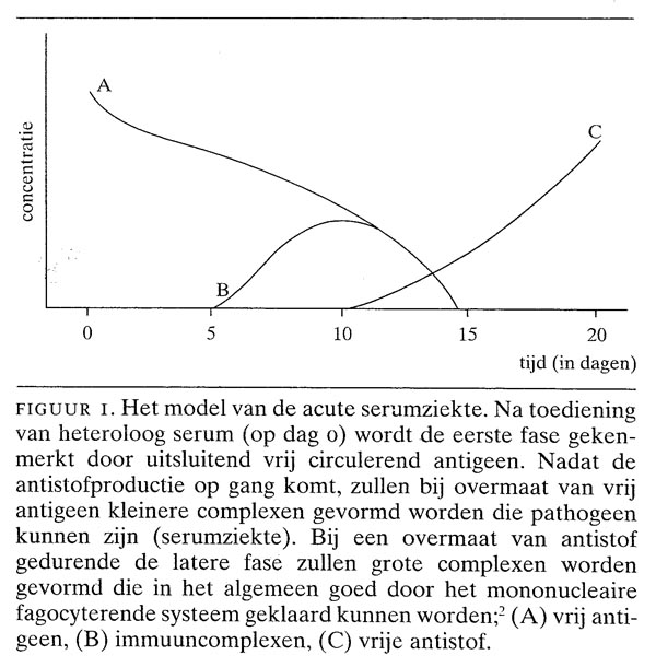 De pathofysiologie van deze reactie werd pas later opgehelderd. Als reactie op de toediening van een vreemd antigeen, in dit geval lichaamsvreemd serumeiwit, ontstaan na 5 tot 7 dagen antistoffen (figuur 1). Deze antistoffen binden zich aan het nog circulerende antigeen en vormen immuuncomplexen, dat wil zeggen aggregaten van antigenen en specifieke antilichamen in verschillende verhoudingen en grootte. Bij een…